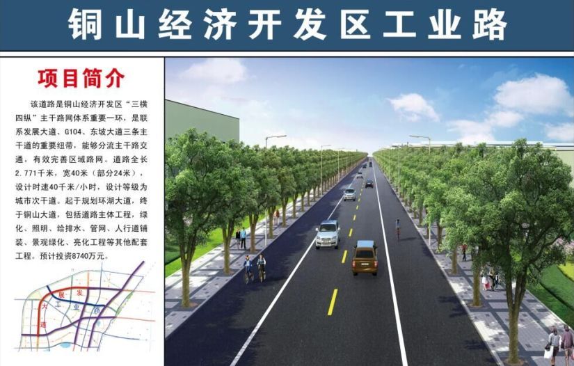 ●工业路建设 (新建):规划环湖大道至铜山大道段,长2.77公里,宽40米(部分24米),设计时速40千米/小时,道路等级为城市次干道。