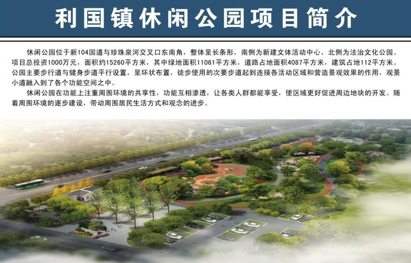 ●镇区休闲公园(暨珍珠泉河景观提升工程)(新建):位于利国文化广场北侧,占地2万平方米,建设亭台楼阁榭,假山,绿化等; 对老104至新104段道路铺设、立面改造、绿化、亮化等。
