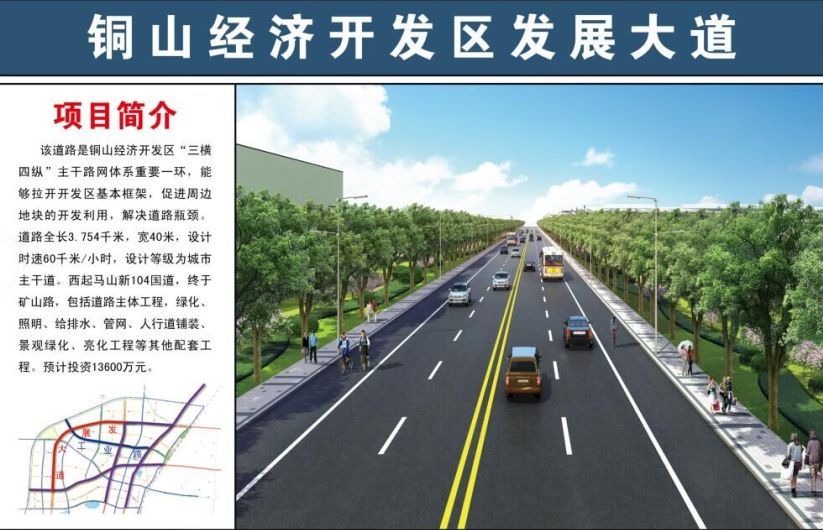 ●发展大道建设(新建): 104国道至矿山路段,长3.75公里,宽40米,设计时速60千米/小时,道路级为城市主干道。