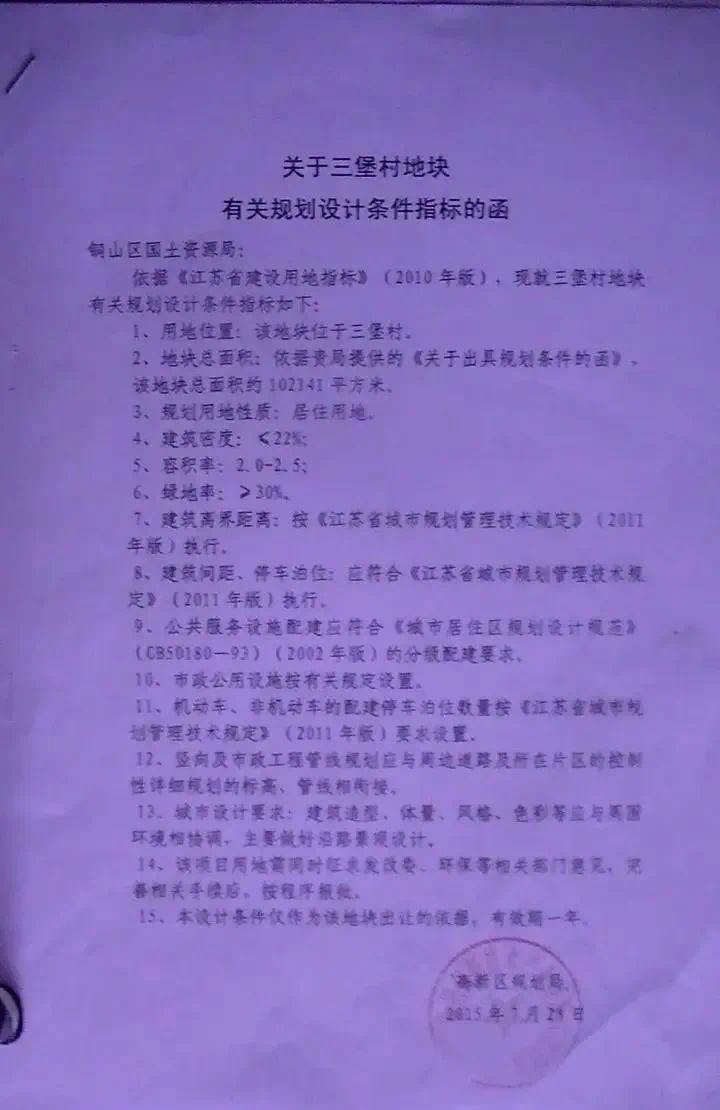 该地块便是由首进徐州的东原地产与徐州市铜山区彭水水务有限公司合作开发铜山2015-81号地块!公告中的徐州绿水置业有限公司便是,东原地产与铜山彭水水务有限公司所成立合资公司,地块案名定为——东原·满庭芳!彭水公司于2015年10月23日在土地市场竟得铜山区2015-81号地块,土地出让金为人民币贰亿柒仟伍佰柒拾捌万元整(小写275780000元),土地面积102141㎡,容积率2.0~2.5,建筑密度≤22%,绿地率≥30%。