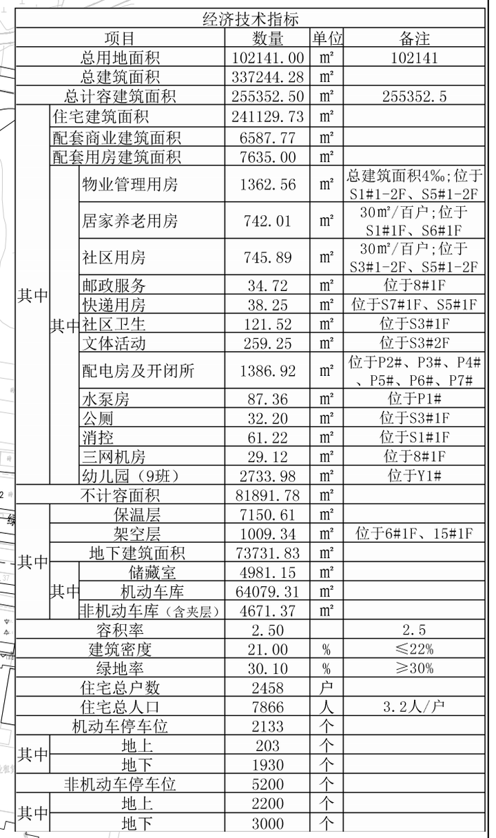 主要经济技术指标: 总用地面积:102141㎡ 总建筑面积:337244.28㎡ 地上计容建筑面积:255352.50㎡ 地下建筑面积:73731.83㎡ 容积率:2.5建筑密度:21% 建筑密度:21% 绿地率:30.1%