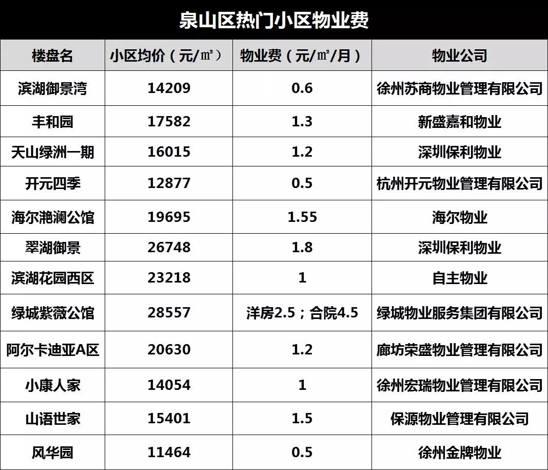如今,很多买房人对小区物业的重视度越来越高,物业费也成为不少人茶余饭后的谈资。 今天,我盘点了徐州60家热门小区的物业费,其中有小区物业费只有0.3元/㎡/月,也有小区高达4.5元/㎡/月! (下表数据来自安居客,如有偏差,欢迎指出。) 泉山区 鼓楼区 云龙区 铜山区 经开区 新城区 在这次统计的6