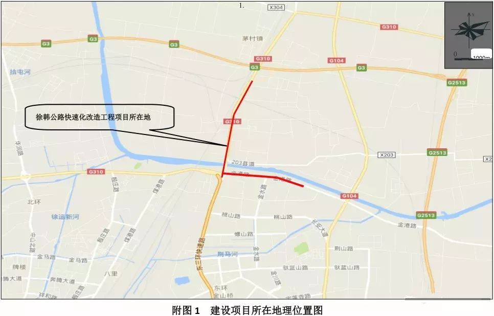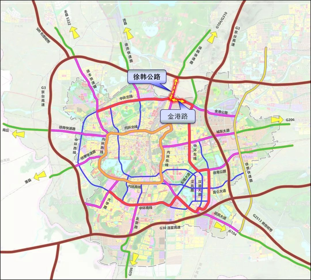 徐韩公路快速化工程位于徐州市东北部鼓楼区、铜山区以及徐州市经济技术开发区。项目道路包括徐韩公路和金港路两段,项目总投资227927.8 万元,改造道路总长约5000m。