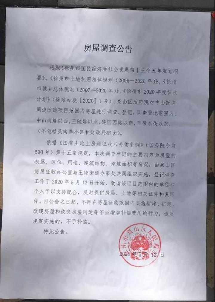 在5月12日时,中山饭店及周边地块改造项目拆迁就已经公示了。征收户数约213户,征收面积约4.06万㎡。(征地范围)未来这块地将作做什么用呢?根据徐州高楼吧网友爆料:中山饭店已经被新盛拿下了。大家认为,这是不是真的呢?
