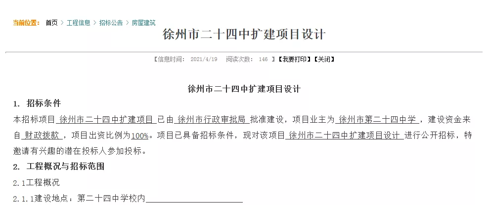 该项目扩建面积约为1.35万平方米,风雨操场跨度42.8米。第二十四中学扩建项目估算价约6000万元;设计费约99.8万元。