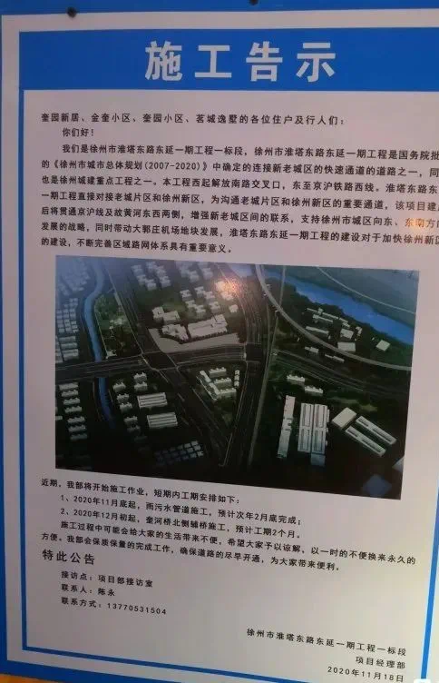 11月18日,奎园和金奎小区的业主们收到了一则施工告示。该告示正是今年上半年就开始招标的徐州重点城建工程之一的淮塔东路东延工程!