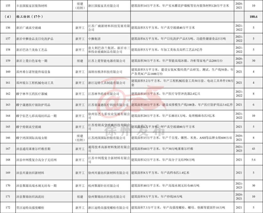 包括新沂新凤鸣功能性纤维、铜山中农批农产品冷链物流园、鼓楼九里山生态修复暨大风歌城等投资体量大、产业质态高、争取尽快落地的项目。