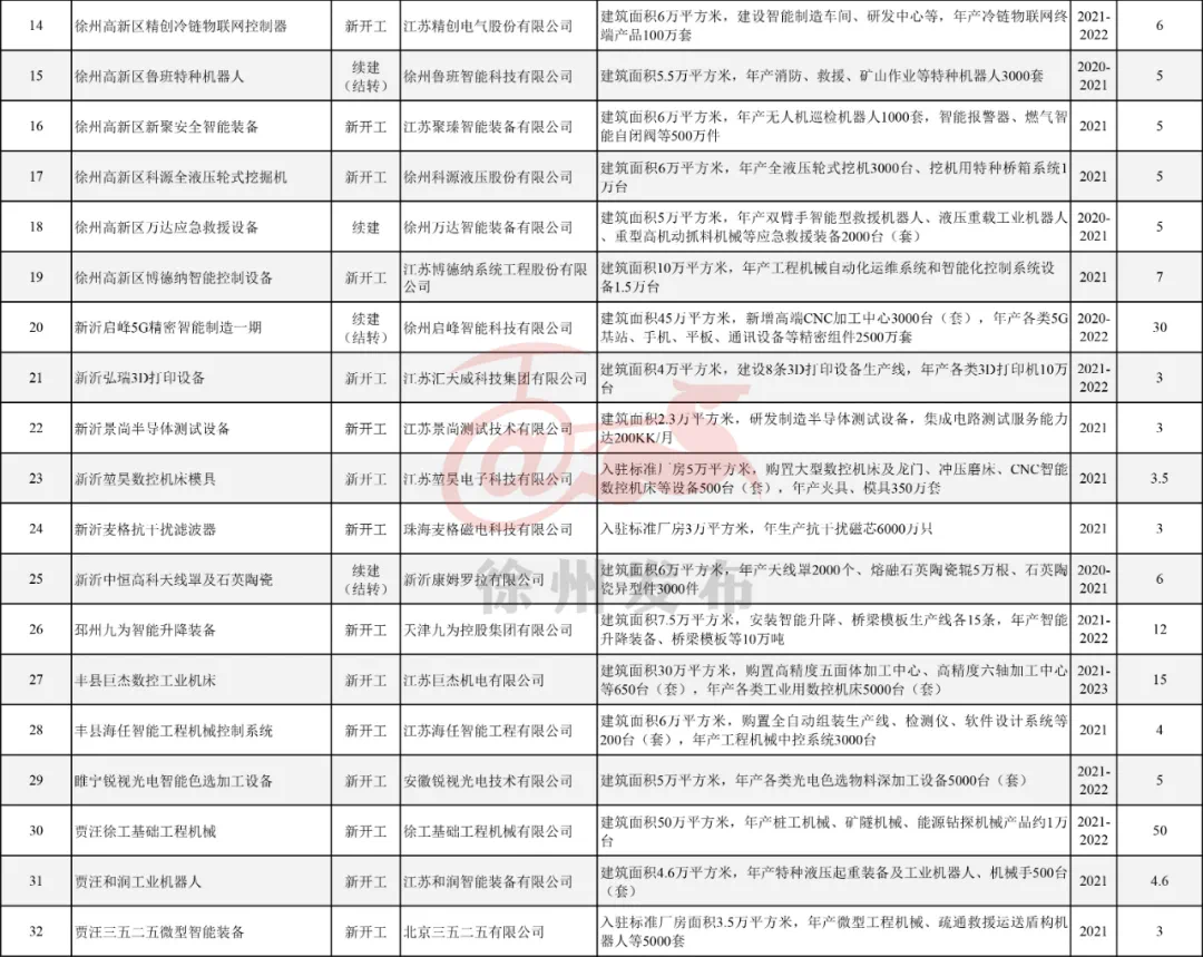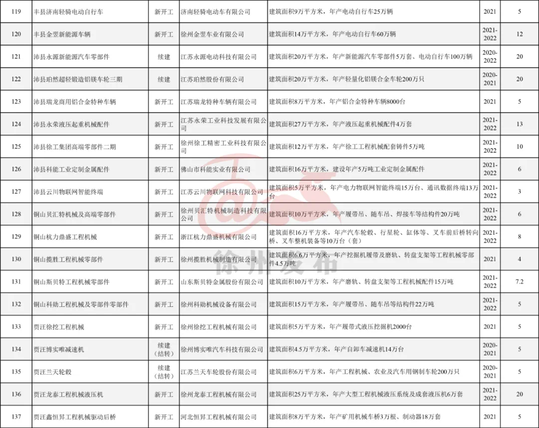 具体项目包括:徐州经开区天通新材料、徐州高新区青山新能源矿卡、丰县巨杰工业机床、沛县修正润康医药、睢宁中航迈特航天新材料、邳州驭芯传感器、新沂温德水性超纤、贾汪徐工基础工程机械等。